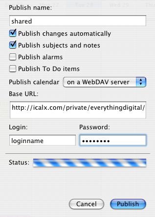 5. Select Publish Calendar: On a WebDAV server. For the Base URL either enter the public or private URL from your user page on icalx that you copied earlier. Make sure you enter the appropriate login and password that corresponds to your icalx account.